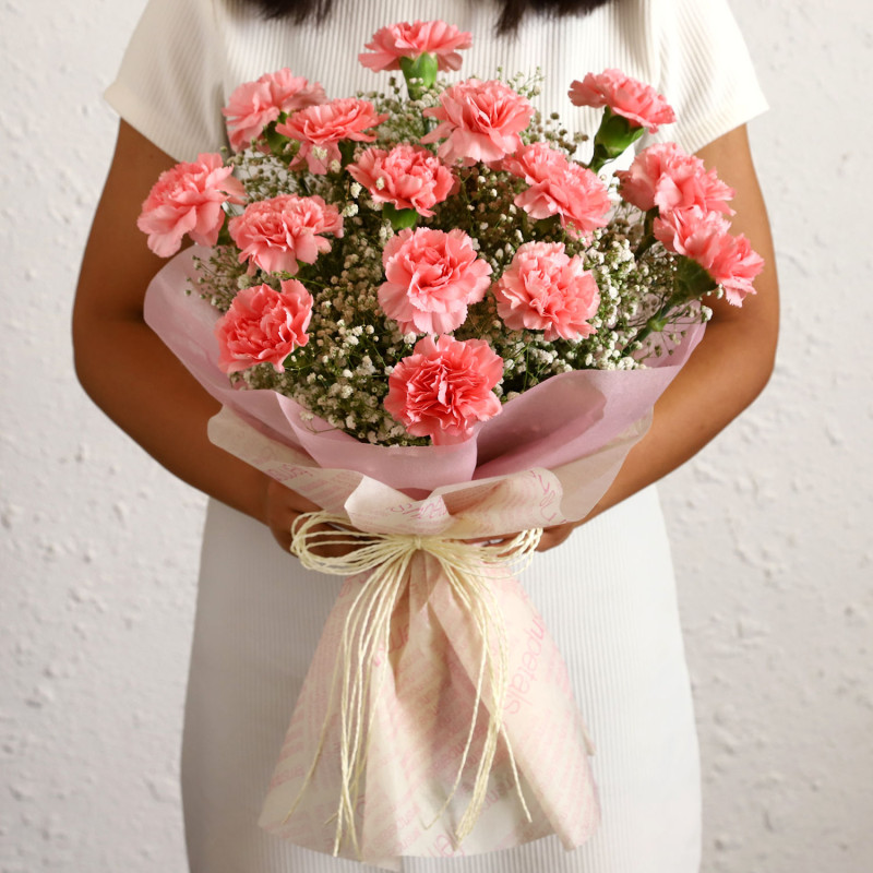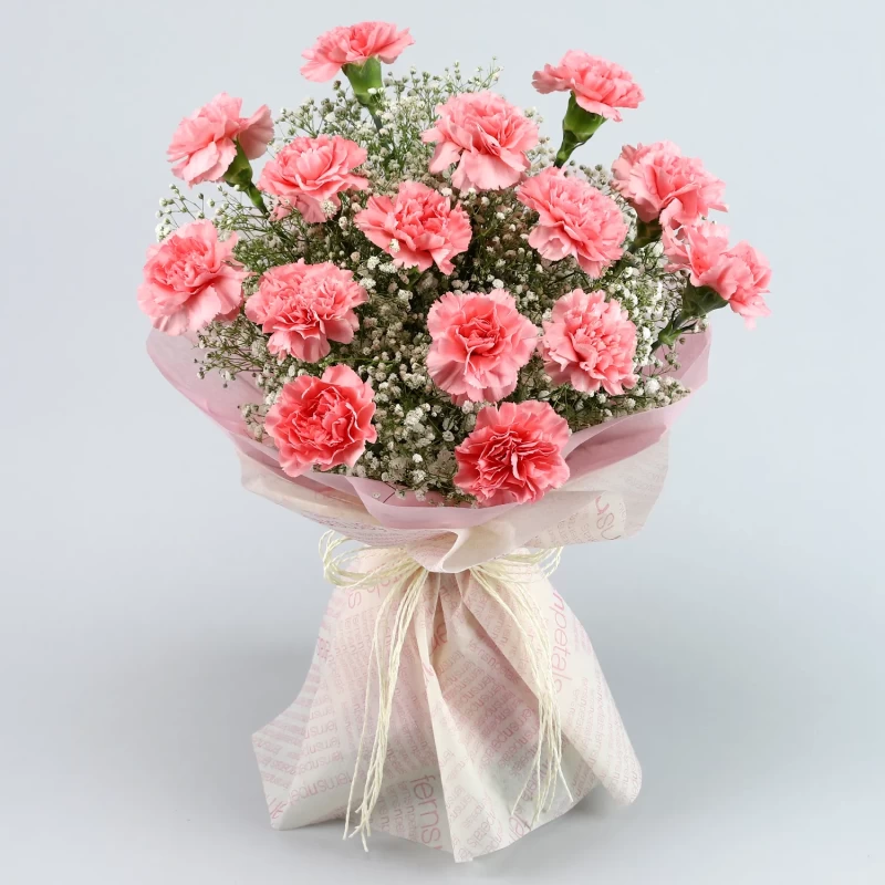 Handpicked baby pink carnations to let the special someone know how much you miss them. Show your emotions with carnations, beautifully arranged in bouquet style and sprinkled with White Gypsophila Gypsy Fillers. These beautiful flowers will make the receiver feel happy and special.